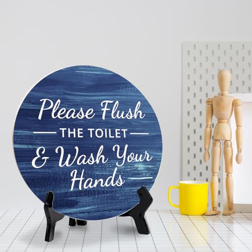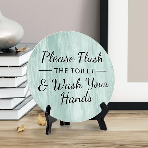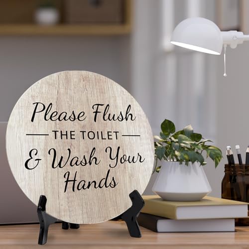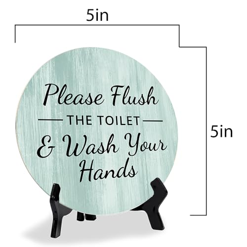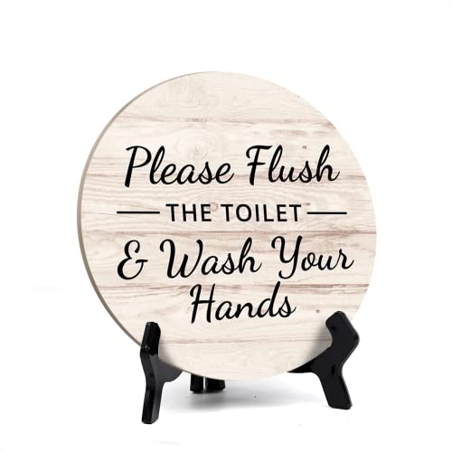 Specification: Round Please Flush The Toilet & Wash Your Hands, Light Wood Color Bathroom Table Sign with Acrylic Easel (5 x 5″)