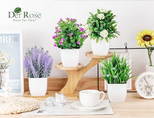 Der Rose 4 Pack Fake Plants Small Artificial Potted Faux Plants with Flowers for Home Bathroom Living Room Office Decor Indoor